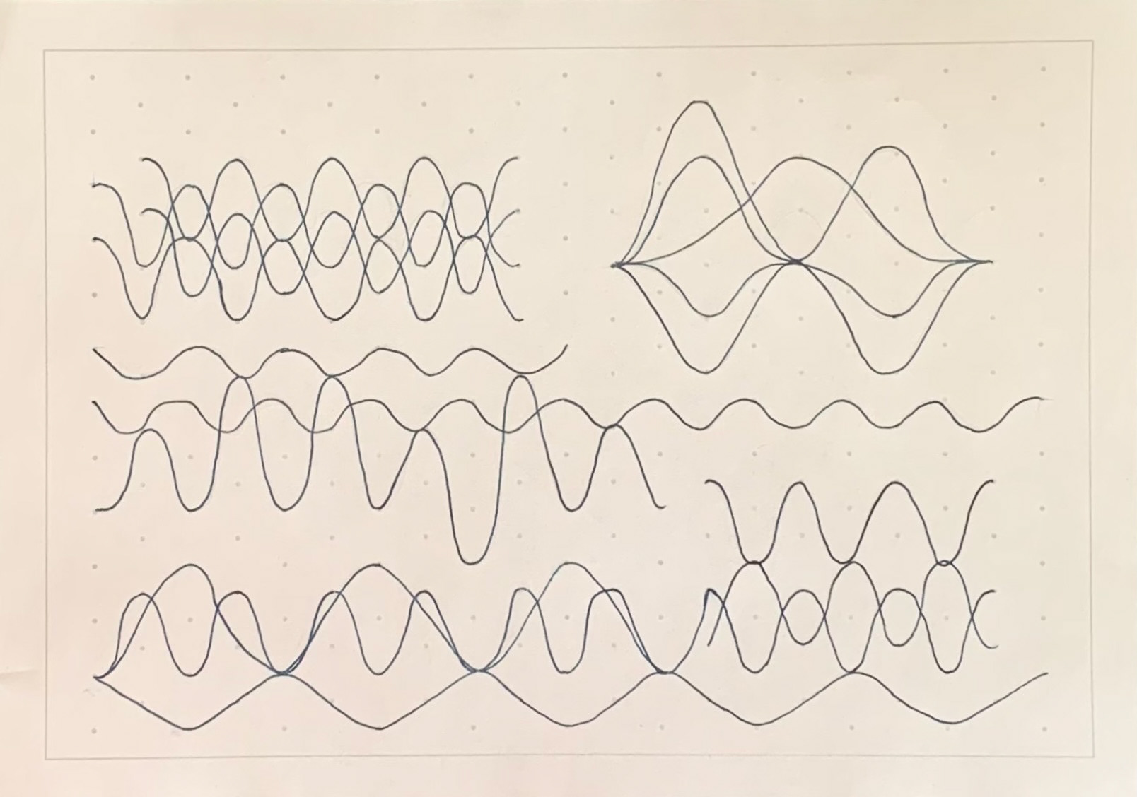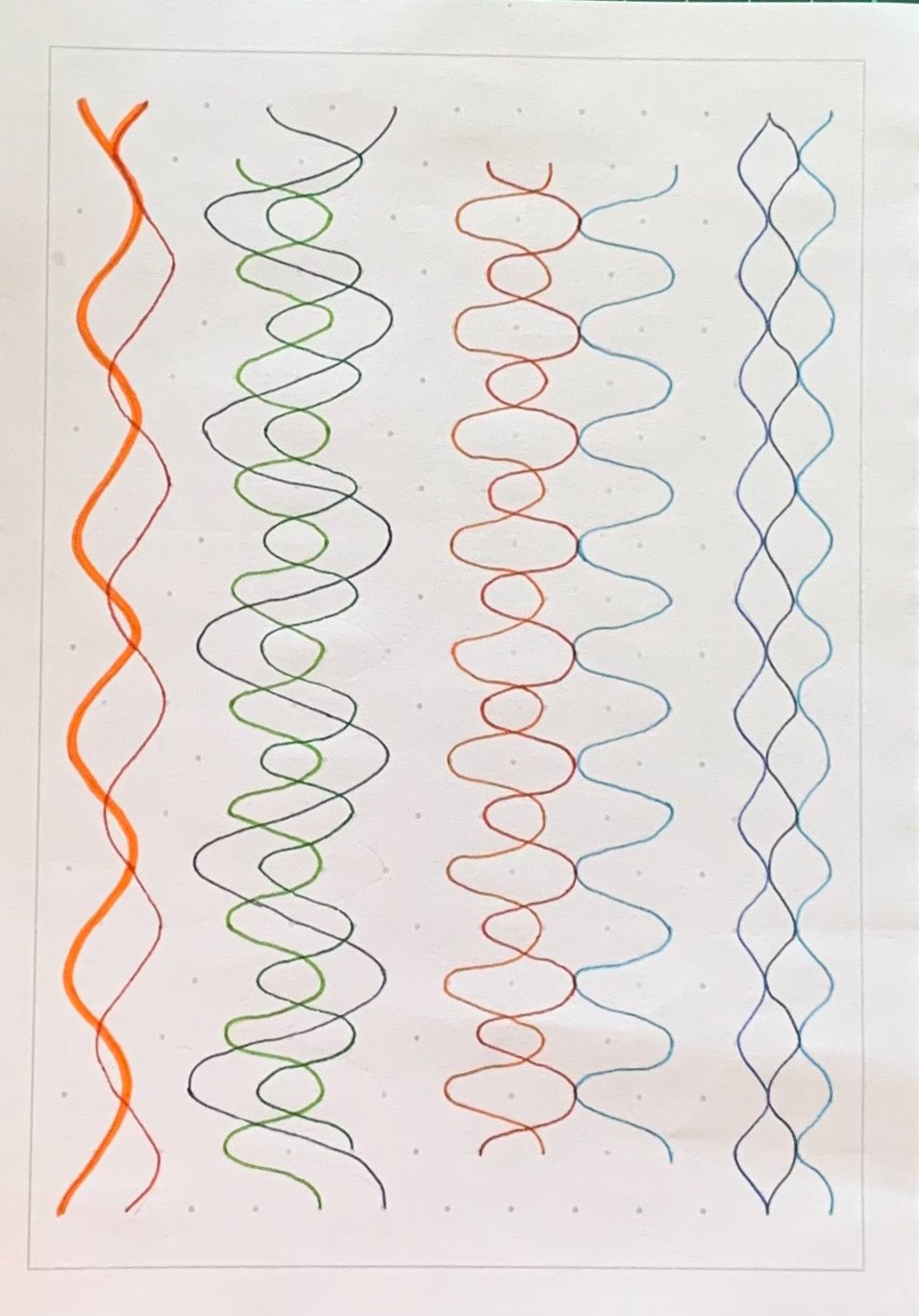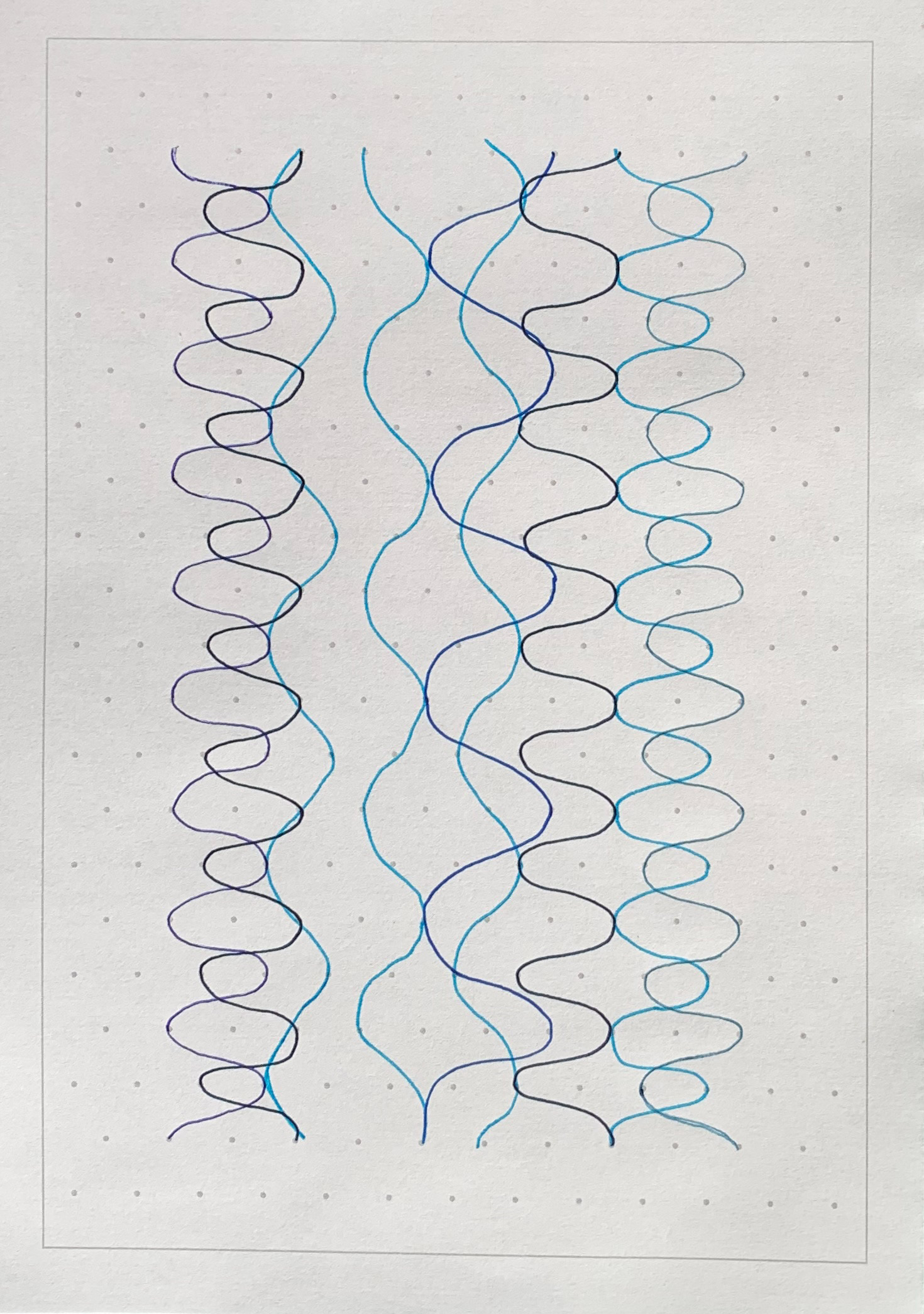 I make boustrophedon and slotted zig zag structures, using isometric paper with drawn undulating lines, on both sides of the paper. New lines are connected and formed as they interact with each other.