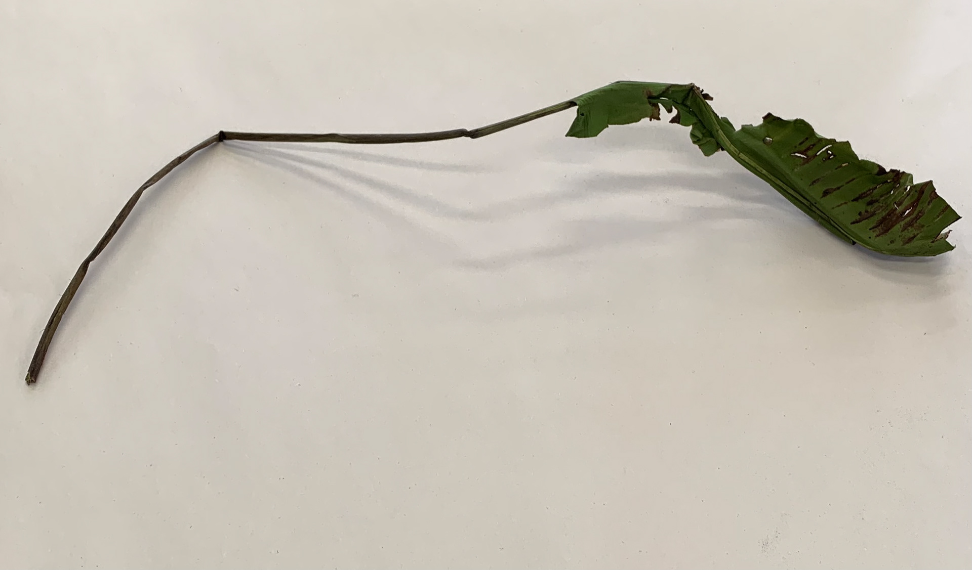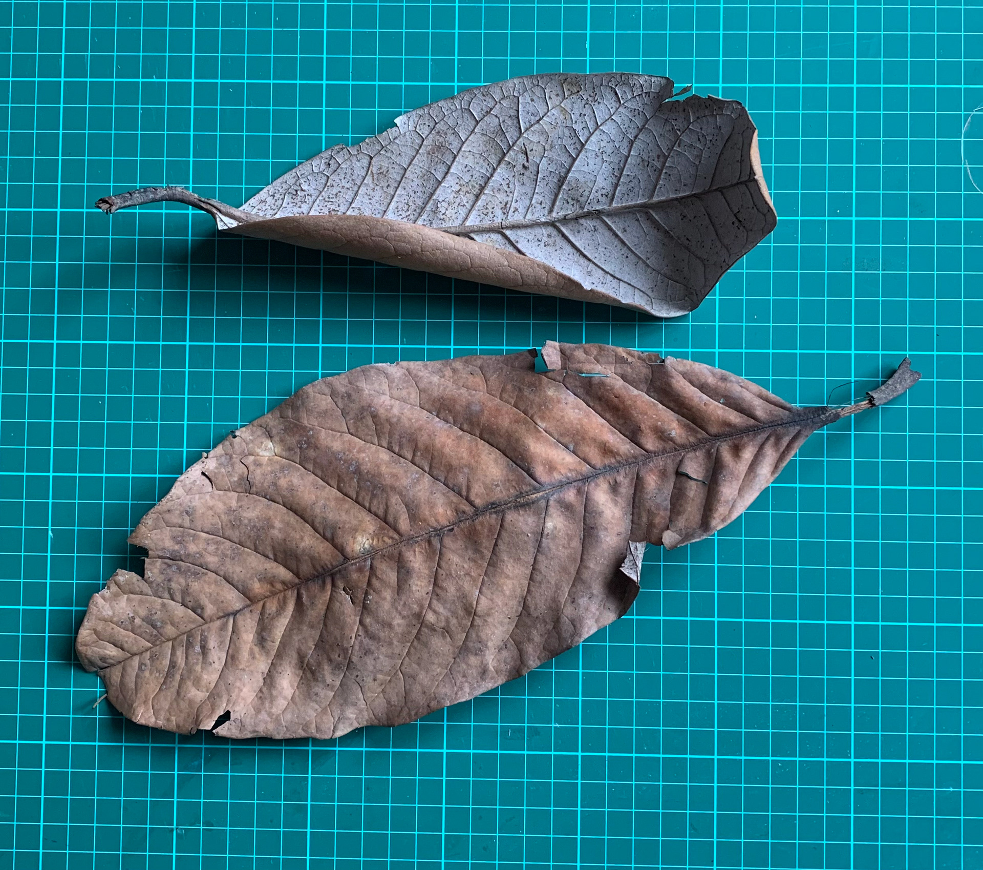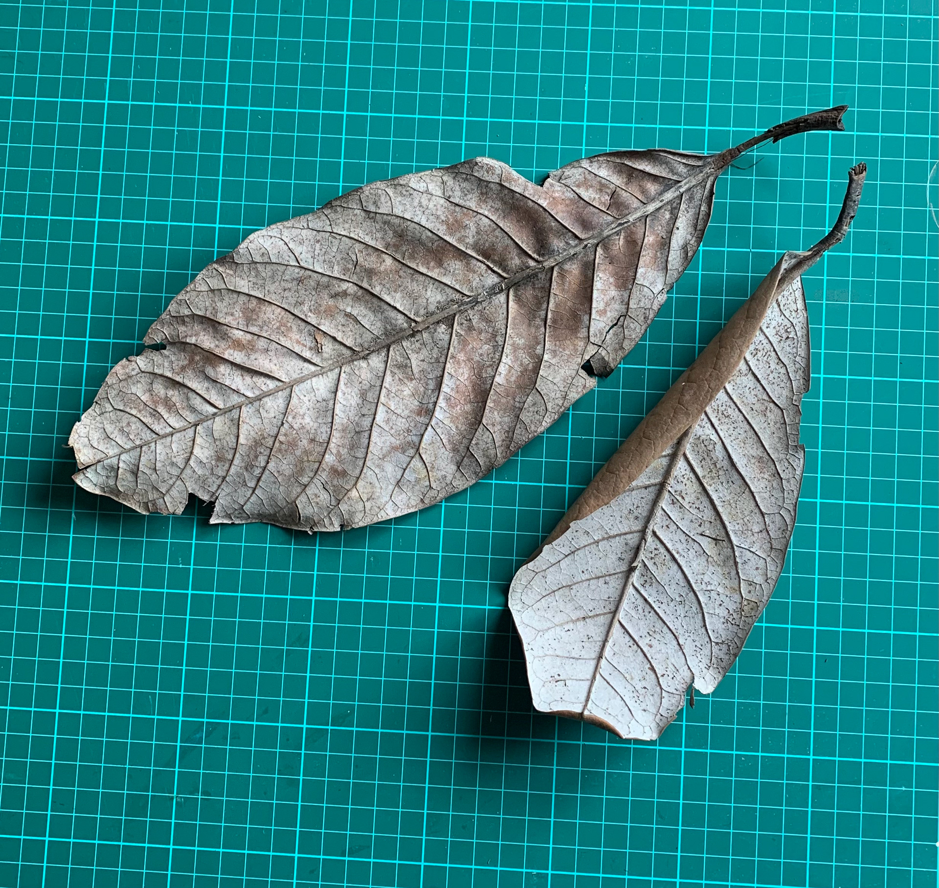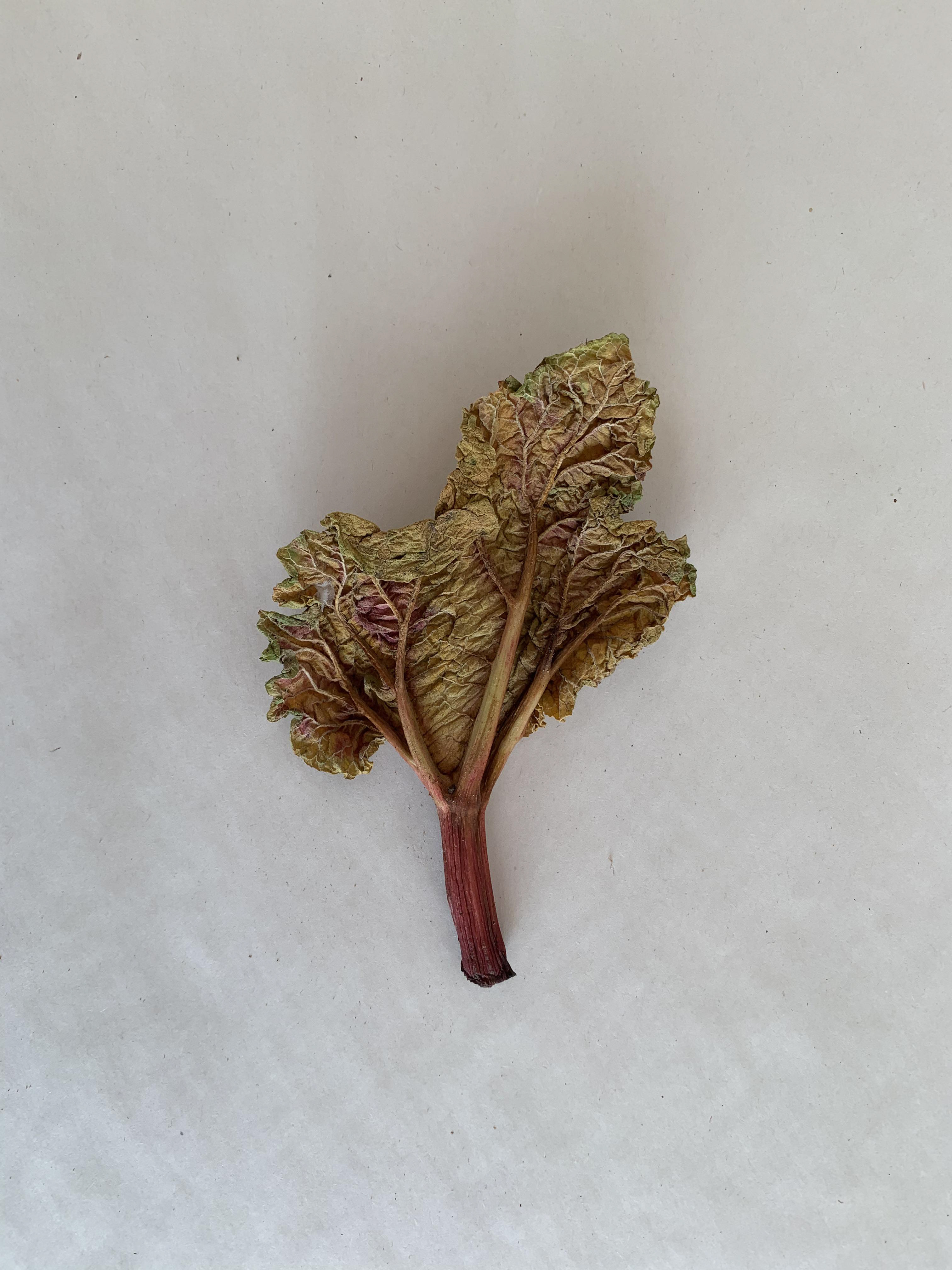 I took pictures of single leaves from a birds eye view on a plain background. The lines within the leaves and the lines and shapes formed are emphasised through use of the minimal background.