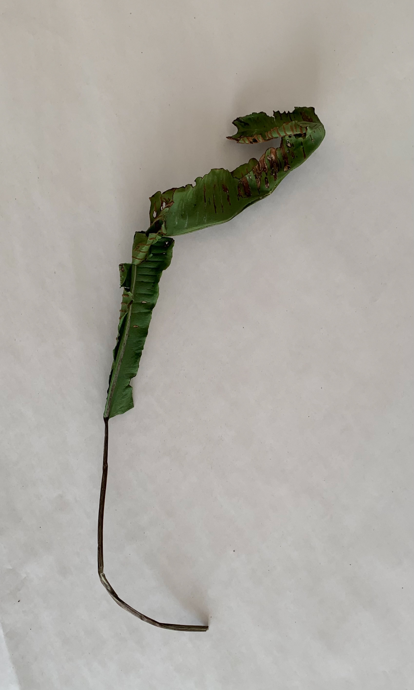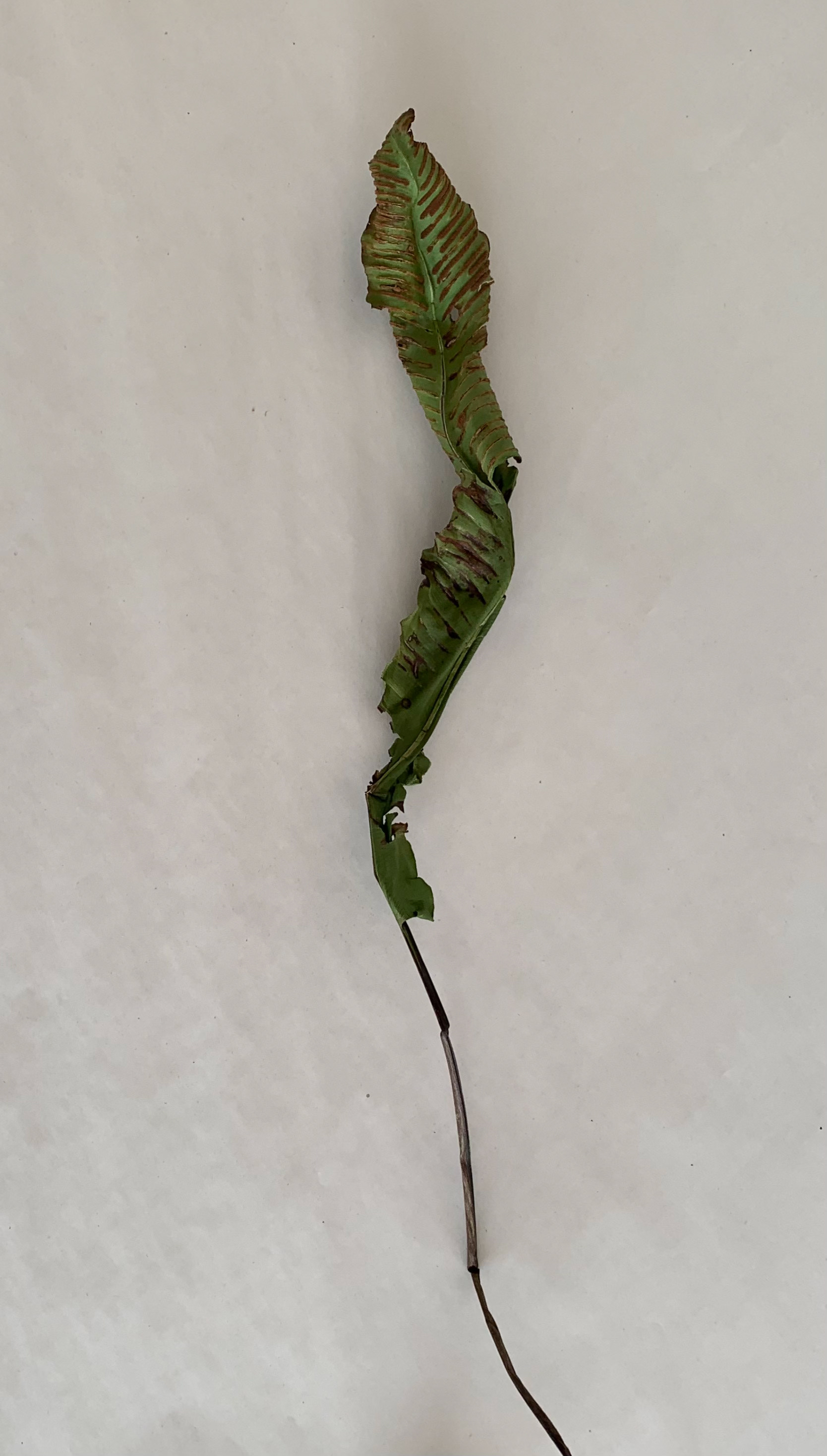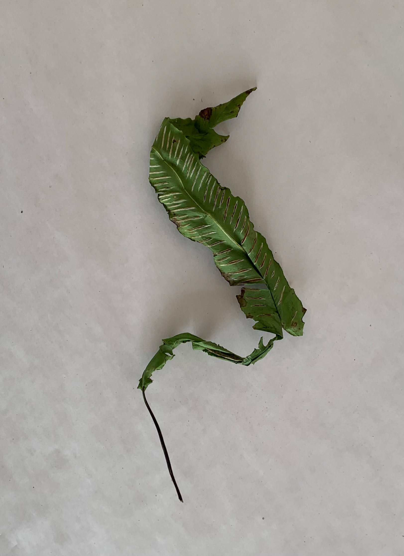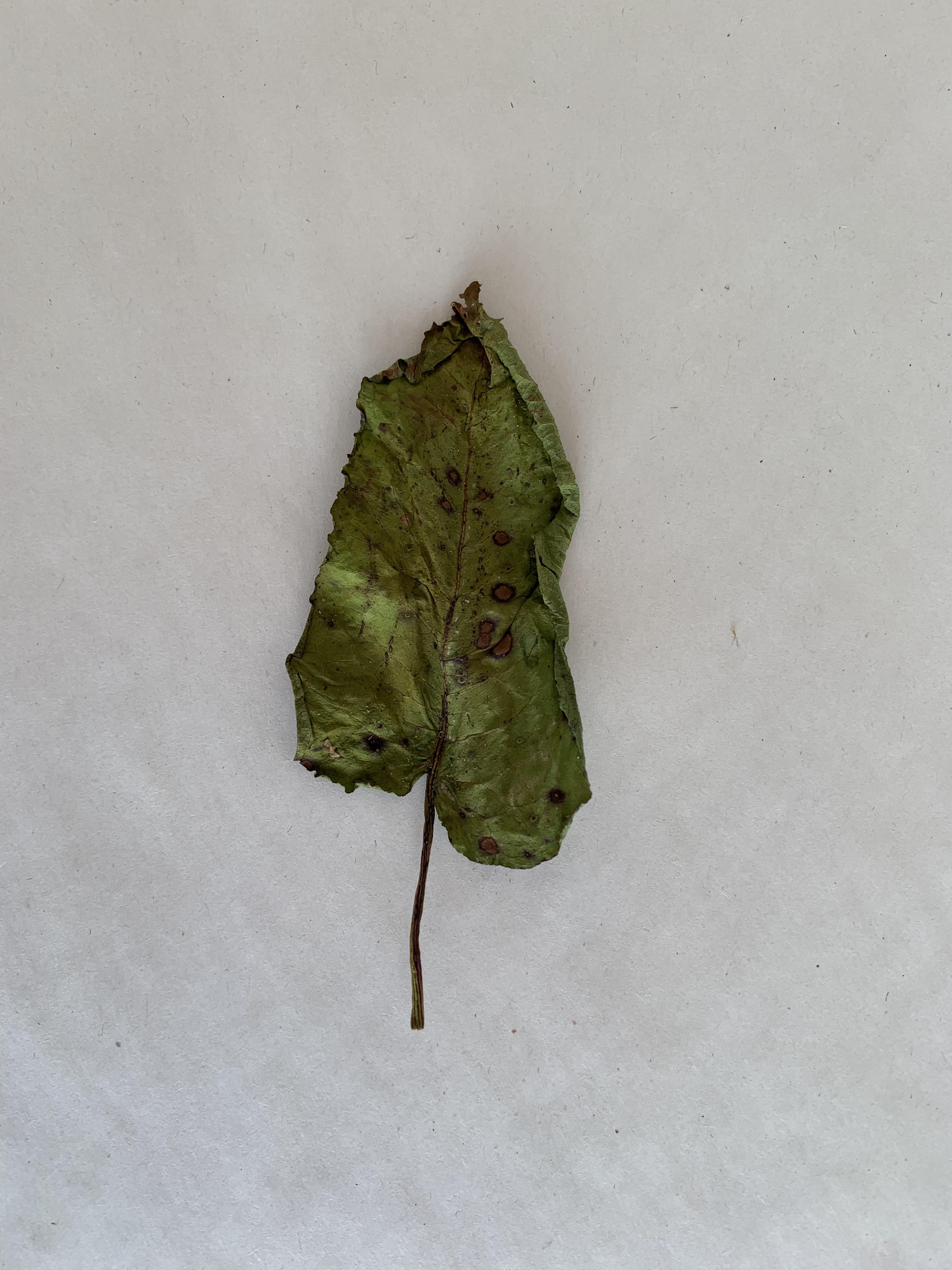 I took pictures of single leaves from a birds eye view on a plain background. The lines within the leaves and the lines and shapes formed are emphasised through use of the minimal background.