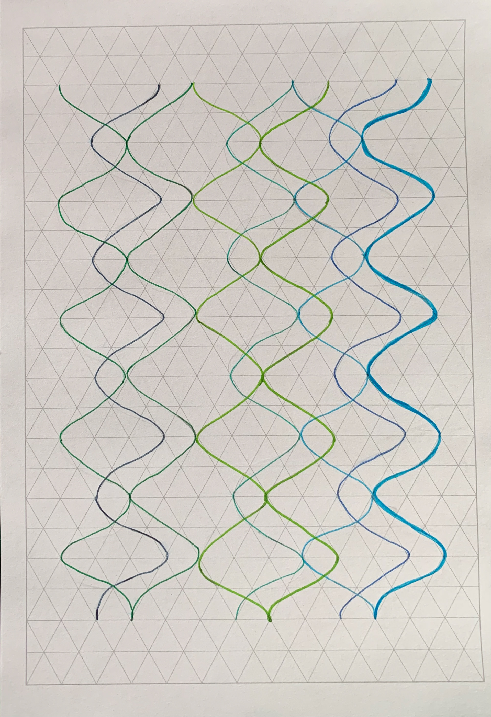 I use isometric paper to create various undulating lines, experimenting with the variety of regulated lines.