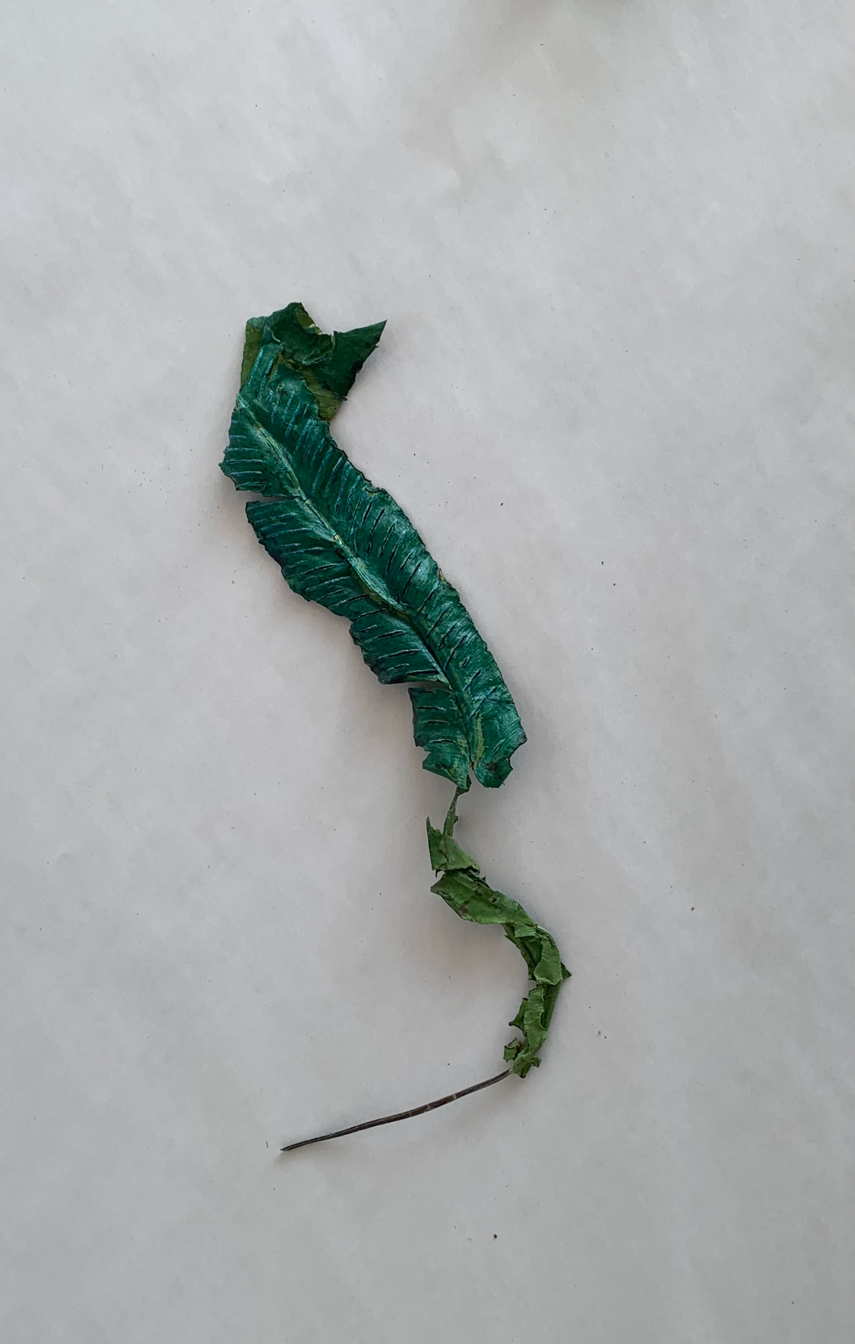 I collagraph a big fern leaf and explore the relationship between the scale and position of the work on a wall. Displaying the work at eye level could prompt a subconscious conversation with the viewer exploring their lines of their own body. Also, investigating how the natural outline of the leaf and the lines within are translated through the printing process. The line of the outer silhouette is emphasised in the first print, with the lines within the plant only making an impression on the paper; they have no colour. The print of just the leaf focuses on the lines within the leaf and the lines raised within the leaf as they carry ink.